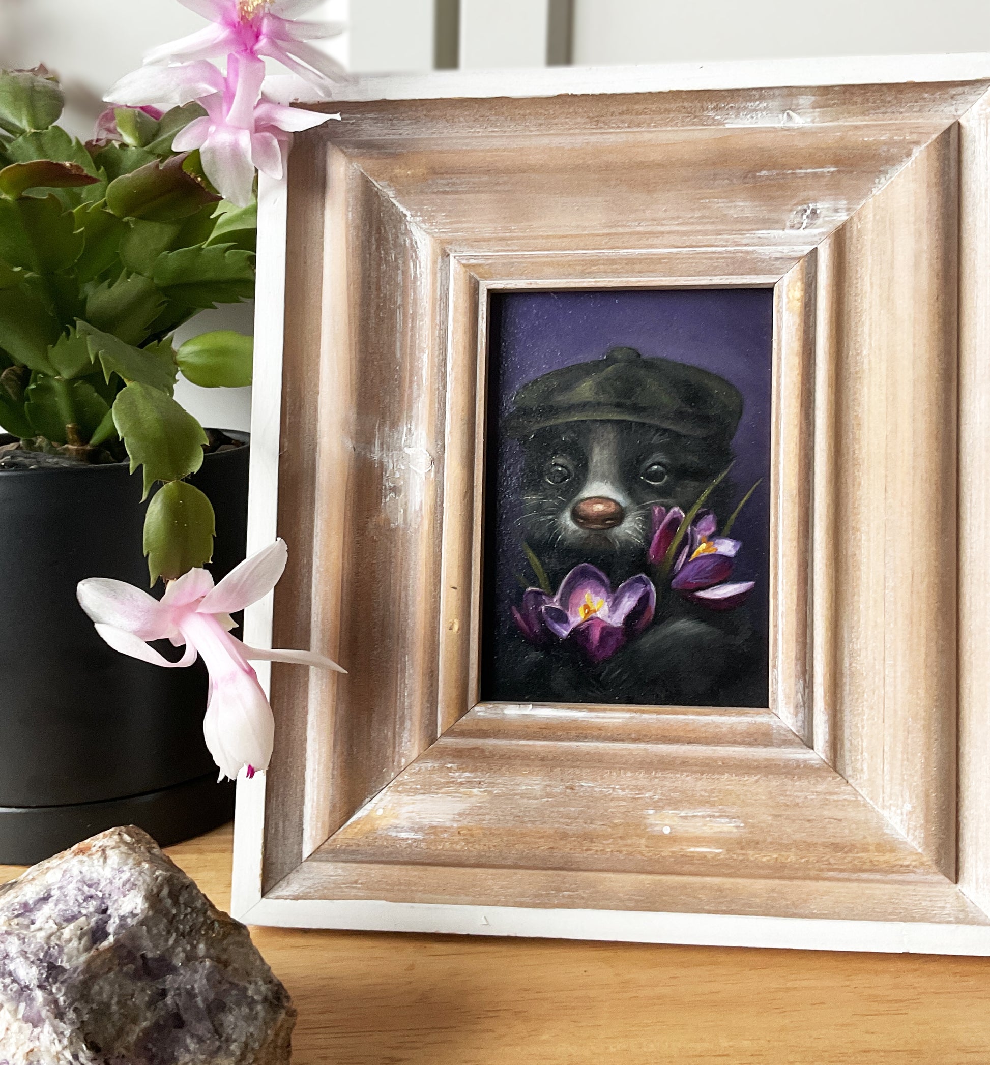 This gentle skunk, bundled up in his little cap and holding an armful of purple crocuses, is full of faith in what new beginnings can bring. Painted in oil on heavyweight watercolour paper in a wall mounted frame, he brings an optimism that is rare in the world.